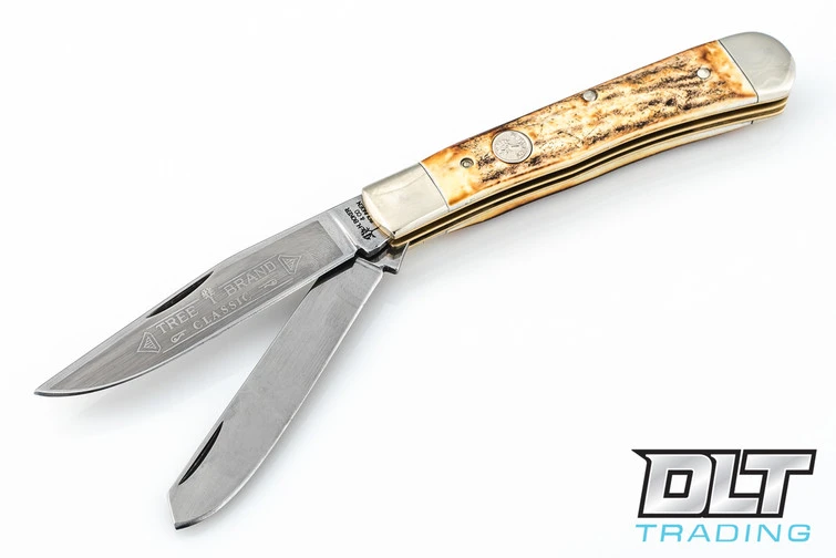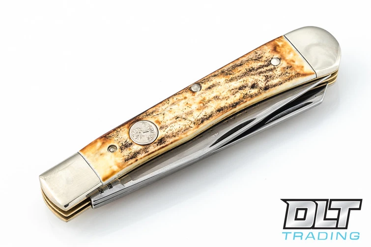 The classic Trapper pattern, with carbon stainless blades and stag handles.